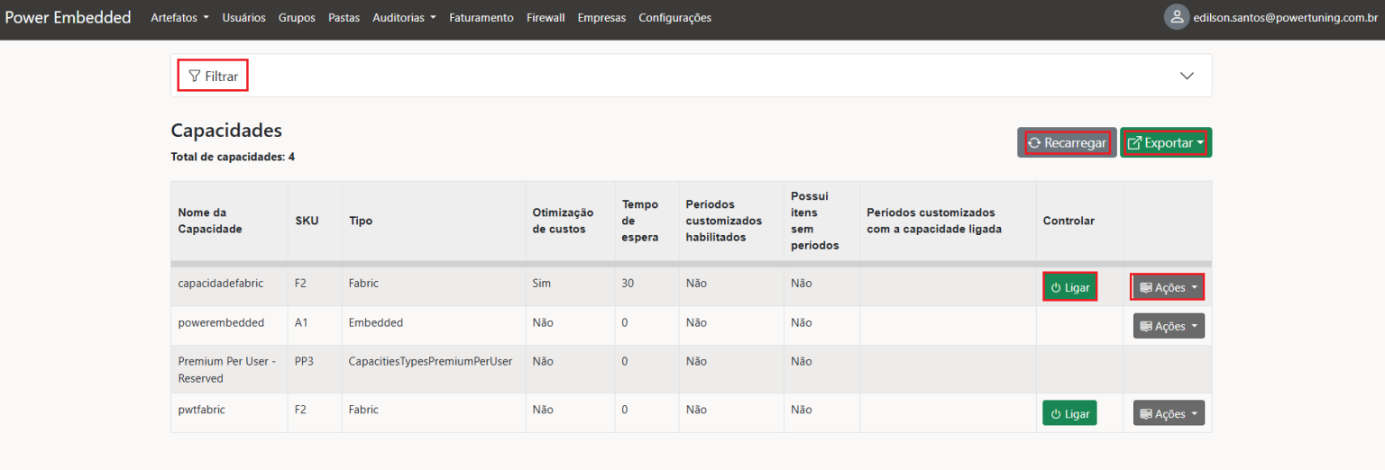 **Recarregar:** Utilizado após configurar no Portal do Azure para atualizar os metadados da capacidade e exibir o botão de controle.