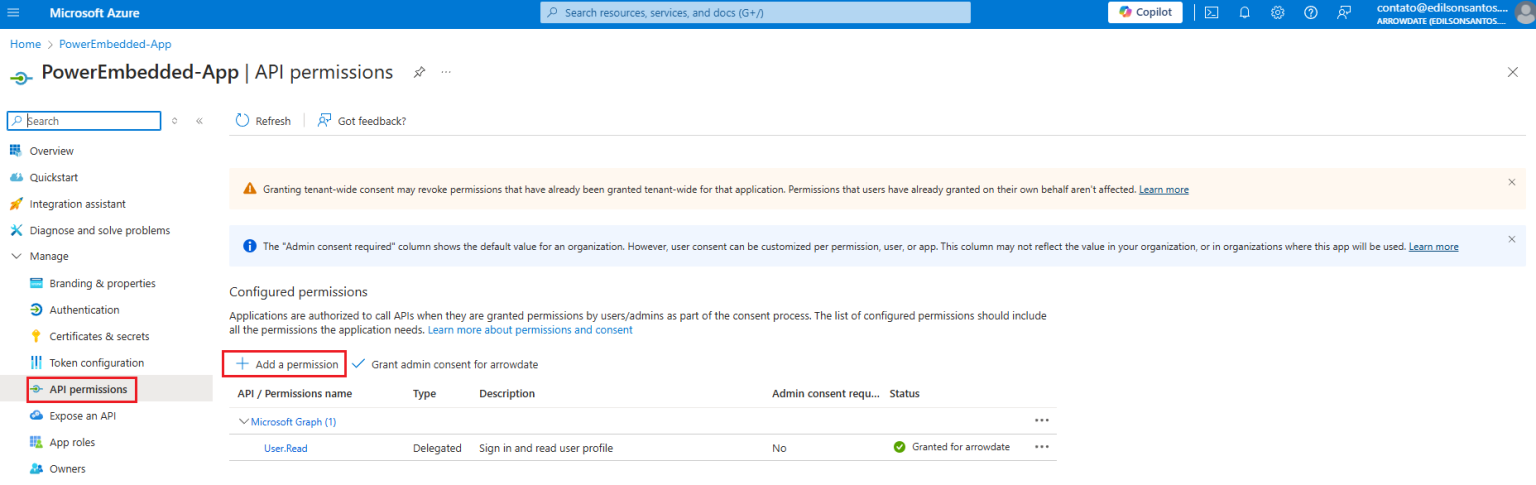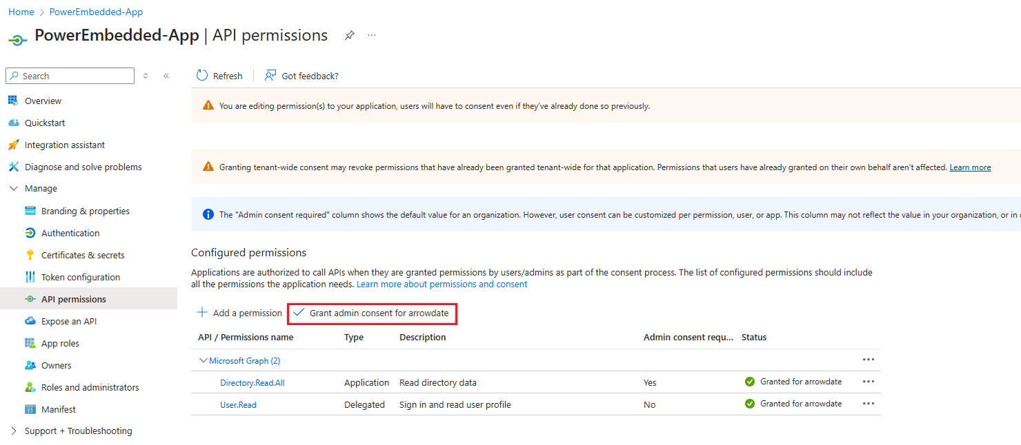 Finally, grant the administrator's consent by clicking on **Grant admin consent for**.