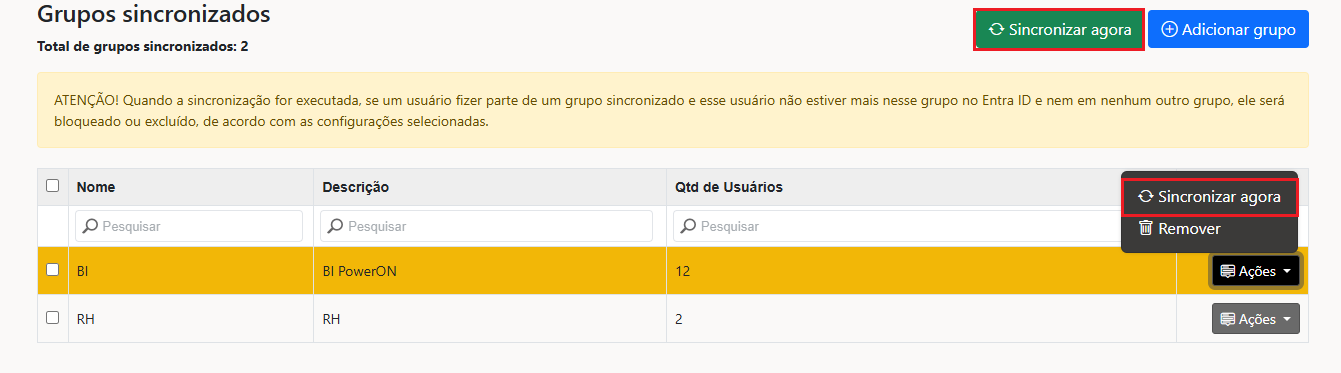 If you want to import a few users at a time, instead of importing or synchronizing a group, read the article [Importing Users from Entra ID](https://docs.powerembedded.com/portal-de-administracao/usuarios/importar-do-entra-id).