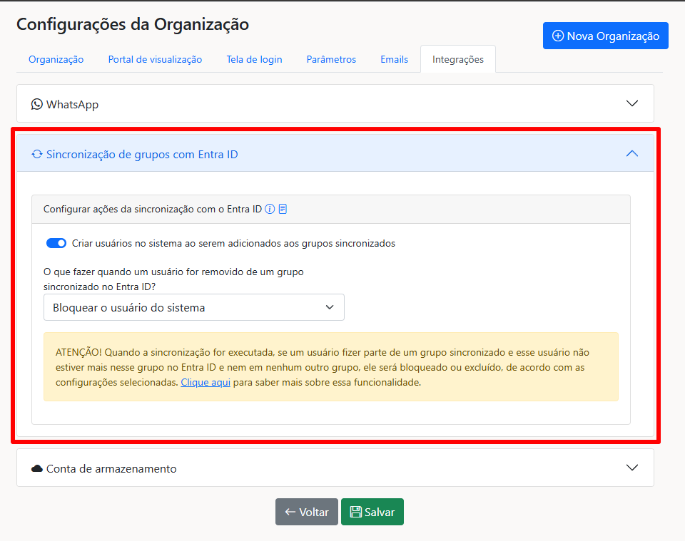**Create user in system when added to synchronized groups:** This permission is responsible for automatically registering in Power Embedded and associating with the respective groups in the system, users who are added to synchronized groups in Entra ID. If this permission is disabled, new users created in Entra ID will not be added to the system automatically.