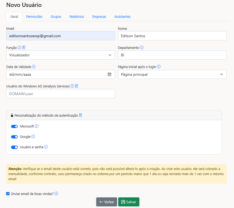 In this tab, you can enter the user's e-mail, name, role, department and expiration date. It also defines the home page after login and the authentication method to be used.