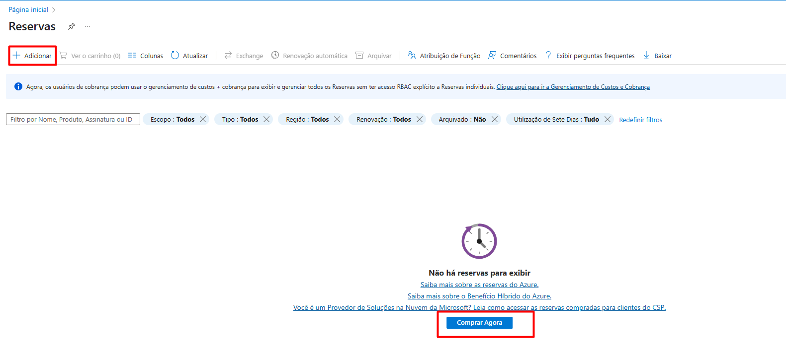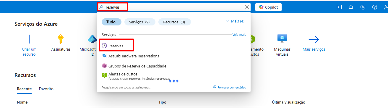 Acessar o portal Azure <http://portal.azure.com>  e pesquisar por "**RESERVAS"**