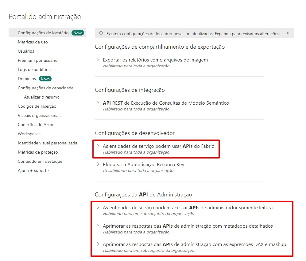 Seguem atividades que iremos realizar no portal de Administração do Power BI (alguém com permissão “Fabric Administrador” deve executar):