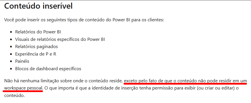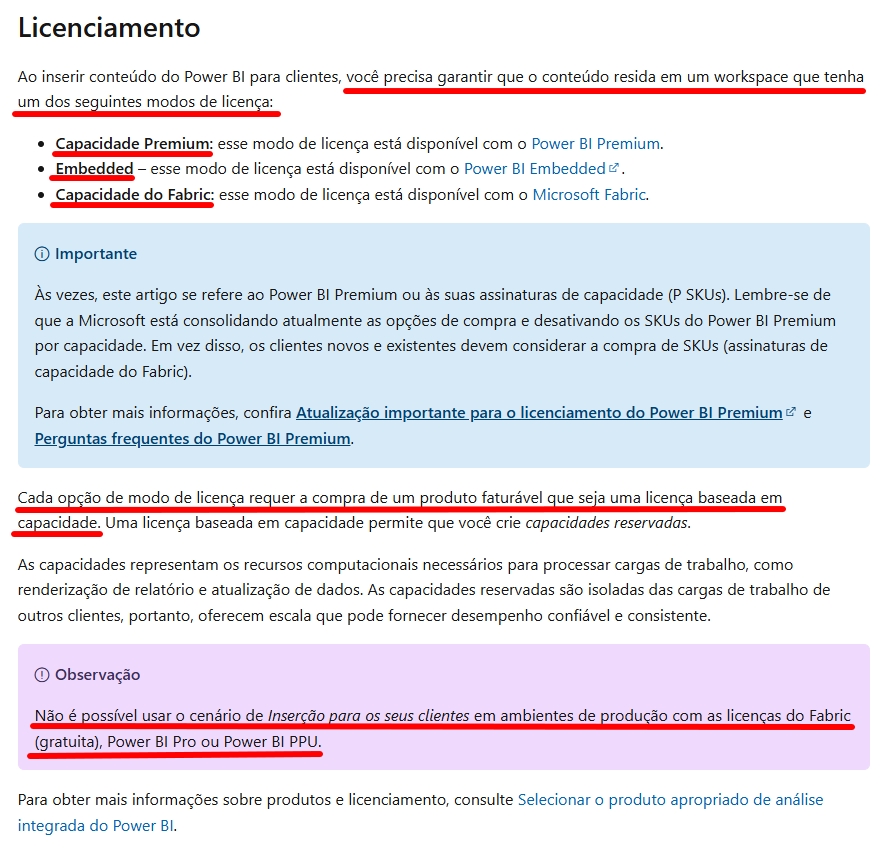 A página Cenários de uso do Power BI: inserir para clientes – Power BI | Microsoft Learn também reforça que o uso de uma capacidade é obrigatório para utilizar tecnologias de Embedded