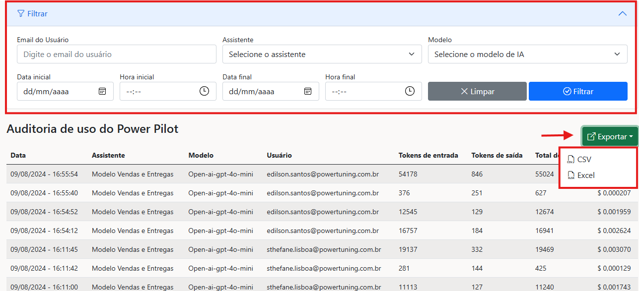 A aba de auditoria no Power Pilot oferece uma visão detalhada sobre o uso dos assistentes. É possível identificar os modelos e usuários envolvidos, além de acompanhar os tokens de entrada e saída gerados em cada interação. O custo estimado do consumo de tokens também fica disponível para consulta.