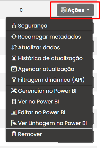 Nas opções de ação, você pode gerenciar regras de RLS, verificar o histórico de atualizações e acessar atalhos para o serviço Power BI.&#x20;