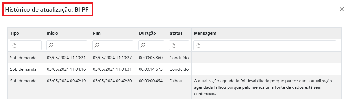 **Atualizar dados**: Força a atualização dos dados na **fonte**.