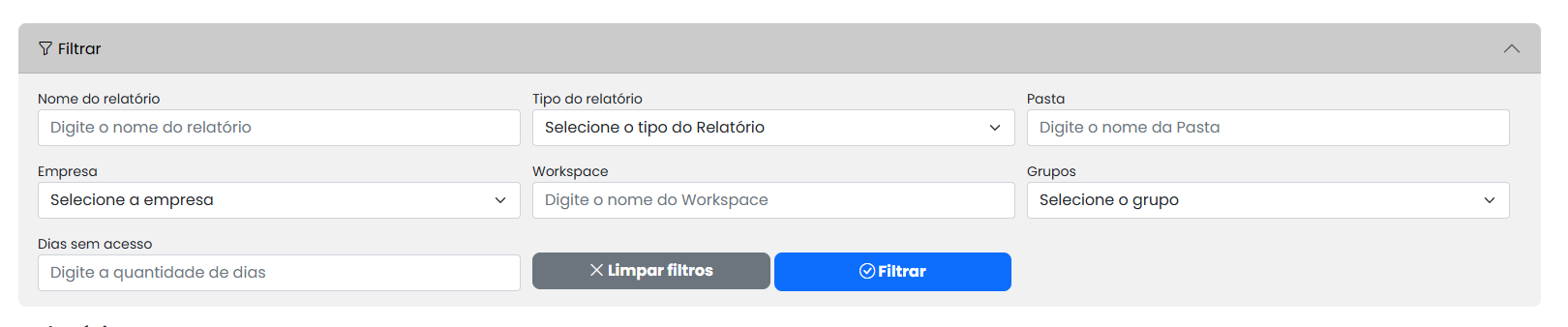 Pensando em praticidade na gestão das permissões de relatórios, na mesma tela você pode aplicar filtros para encontrar facilmente o relatório específico ao qual deseja aplicar as permissões necessárias.
