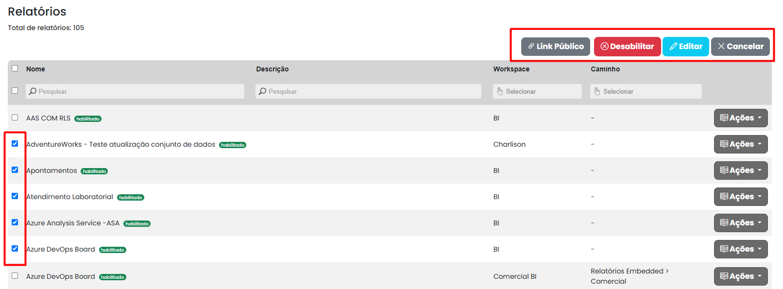 * **Desabilitar:** Desativa temporariamente o relatório para que ele não fique visível para os usuários.