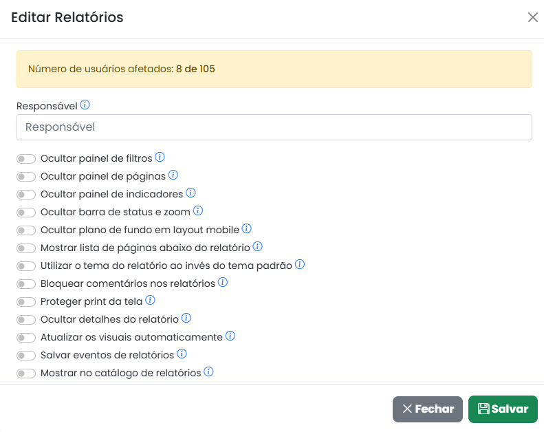 Isso permite atribuir um responsável para todos os relatórios e definir algumas permissões em massa para editar todos os relatórios selecionados de uma vez.