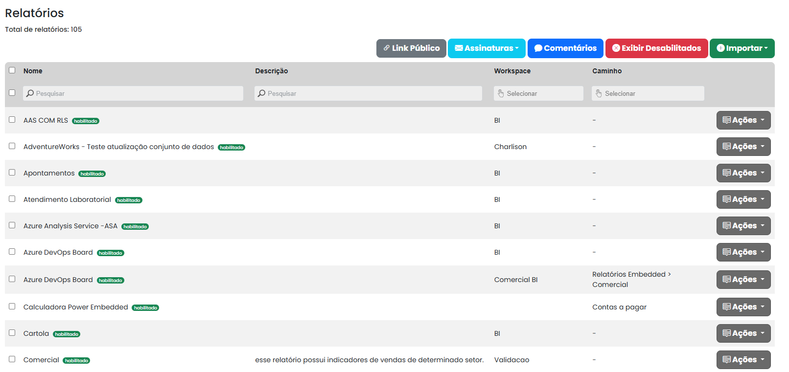 Nesta tela é onde você poderá importar os relatórios, configurar segurança ao nível de linha (RLS), permissões de relatórios e muito mais.