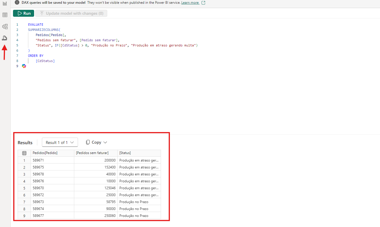 * Por exemplo, a consulta abaixo cria uma tabela listando os pedidos, o valor em aberto de cada um e seu status (definido como “Produção no Prazo” ou “Produção em atraso gerando multa” com base no campo ***CdStatus***, ordenando os resultados por ***CdStatus***.