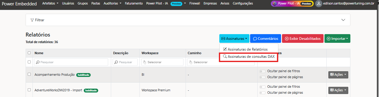 Assim como em outras telas do **Power Embedded**, o gerenciamento na assinatura de DAX foi pensado para ser simples e direto: