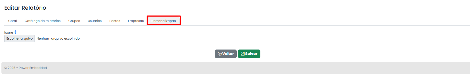 Por padrão, ao importar um relatório ele configurado com o ícone padrão do Power BI. Caso queira inserir uma miniatura para facilitar a visualização dos usuários, utilize essa aba