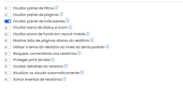 Nesse campo voce encontrá opções para configuração do relatório selecionado, como ocultação de filtros, paginas, indicadores e etc.