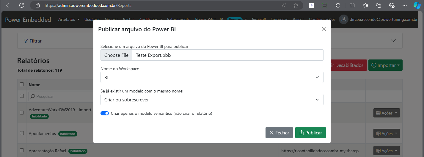 Pronto! Seus usuários já podem realizar a publicação dos arquivos do Power BI pelo Power Embedded.