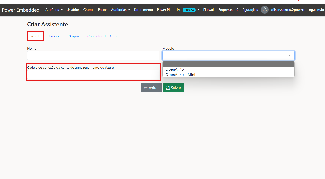 4. [Criar um assistente](https://docs.powerembedded.com/power-embedded-documentacao/portal-de-administracao/power-pilot-ia/assistentes-de-ia) no Power Embedded (você está aqui)